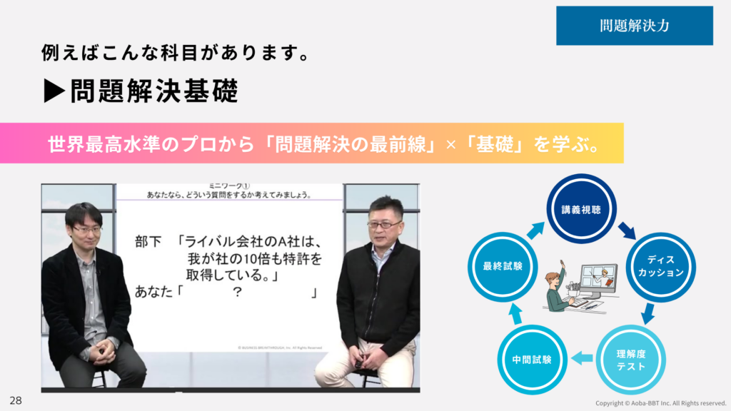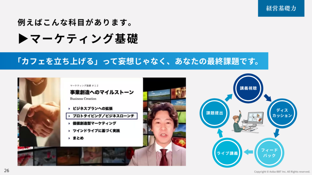 BBT大学では、単なる理論の暗記ではなく、実際の企業経営やプロジェクトを題材にしたケーススタディ形式の授業を行っています。以下のカリキュラムはその一例です。
